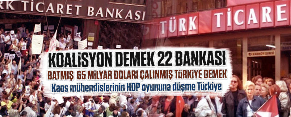 HDP’nin barajı aşması ve AK Parti’nin tek başına iktidar olmamasını isteyen çevreler; 22 bankası batmış, 65 milyar doları hortumlanmış bir Türkiye tablosu özlüyor! Koalisyon isteyenlerin özlediği tablo Paralel Yapı, Doğan medyası, CHP ve HDP, AK Parti’nin tek başına iktidar olmaması ve ülkenin bir koalisyon hükümeti tarafından yönetilmesi için mücadele ediyor. …