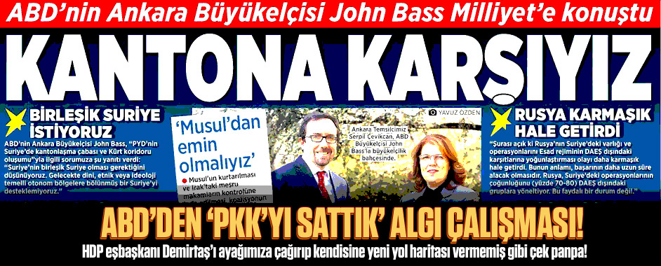 Bir yandan HDP eşbaşkanı Selahattin Demirtaş’ı Washington’da ağırlayıp eline yeni “yol haritası” veren ABD, diğer yandan PKK ve türevleri PYD ile YPG’yi satmış gibi bir algı oluşturmaya çalışıyor. ABD Büyükelçisi Bass’ın bugün Milliyet’te yer alan röportajı ABD’nin PKK/PYD/YPG’den desteğini çektiği mesajlarıyla dolu. Bass Cerablus’u IŞİD’den temizleyecek operasyonlarda PKK’nın Suriye kolu …
