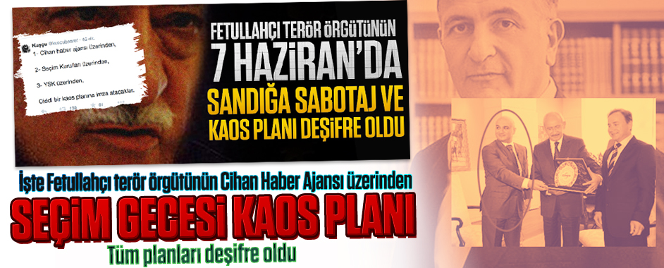 Fetullah Gülen’in sosyal medyadaki tetikçisi Fuat Avni üzerinden seçim operasyonunu başlatan Fetullahçı Terör Örgütü, seçim gecesi operasyonunu Cihan Haber Ajansı üzerinden yapacak. Seçim üzerinden kaos operasyonunu yöneten Genel Müdür Yardımcısı Hakan İnce, bütün emirleri Ekrem Dumanlı’dan alıyor. İşte seçim gecesi Fetullahçı Terör Örgütü’nün kaos planı. Fetullahçı Terör Örgütü, 7 Haziran …