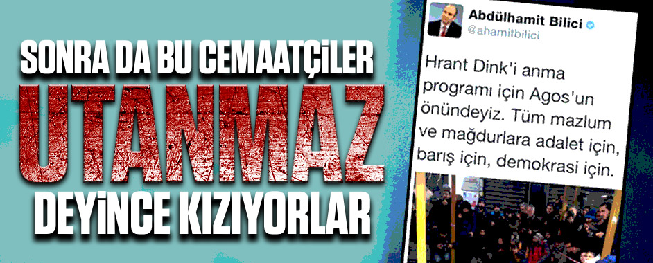 FETÖ gazetecisi Abdülhamit Bilici Hrant Dink anmasından fotoğraf paylaşmasına Nedim Şener’den cevap: “Ben bu cemaatçiler utanmaz deyince kızıyorlar.” Gazeteci Nedim Şener, Zaman gazetesi Genel Yayın Yönetmeni Abdülhamit Bilici’yi Hrant Dink’i anma töreninden atınca eleştiri yağmuruna tuttu. Nedim Şener, attığı tweetlerde Hrant Dink’in ölümü ve ardından yürütülen soruşturma sürecinde Cemaat’in parmağı …