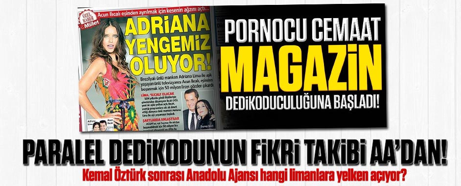 Tape, şantaj, montaj, porno kasetleri servisiyle ünlü paralel örgütün ucuz gazetesi Millet, paparazziliğe başladı. Manşetine bula bula Acun Ilıcalı hakkında bir dedikoduyu çekti. Akın İpek’in sahibi olduğu Pensilvanya’nın ucuz bulvar gazetesinin haberi şöyle: Adı farklı isimlerle anılan Acun Ilıcalı’nın bu kez Brezilyalı Top Model Adriana Lima ile aşk yaşadığı ortaya …