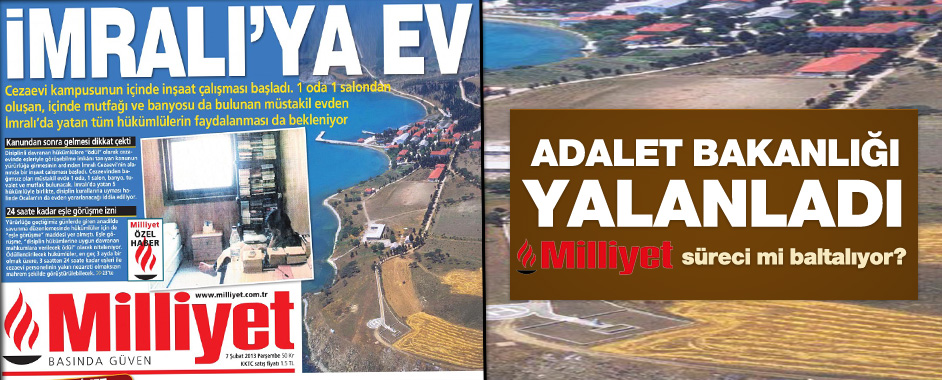 MEDYAGÜNDEM- Bugün Milliyet’in sürmanşetinde yayınlanan “İmralı’ya ev” başlıklı imzasız özel haber Adalet Bakanlığı tarafından yalanlandı. Haberde, “İmralı için ‘ödül’ ev yapılıyor” denilmiş, şu iddialar ortaya atılmıştı: “Abdullah Öcalan’la, terör suçundan hükümlü 5 kişinin bulunduğu İmralı Cezaevi alanında dikkati çekici bir inşaat çalışmasının başladığı ortaya çıktı. Kulislere yansıyan iddialara göre, İmralı’da, …