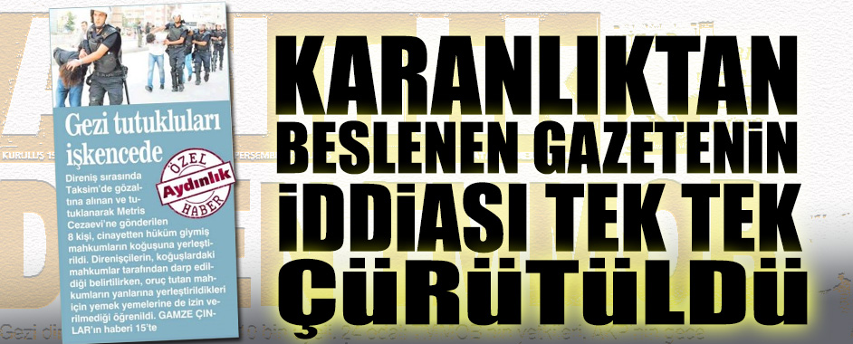 Adalet Bakanlığı, Aydınlık gazetesinin Gezi tutuklularının baskı ve işkence gördüğü yönündeki iddialarını delillerle çürüttü. Tutuklular da kendi imzalarıyla hiçbir şikayetlerinin olmadığını belirterek Aydınlık’ı yalanladı. Gezi darbe girişiminin organizatörleri arasında yer alan ‘Aydınlık’ın mantık dışı suçlamalarını Adalet Bakanlığı madde madde çürüttü. “Gezi Tutukluları İşkencede” başlılığıyla verilen habere Adalet Bakanlığı’ndan yalanlama geldi. …