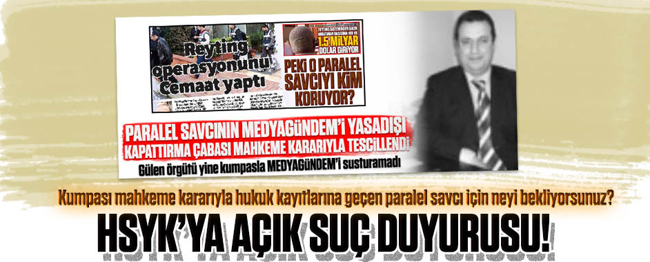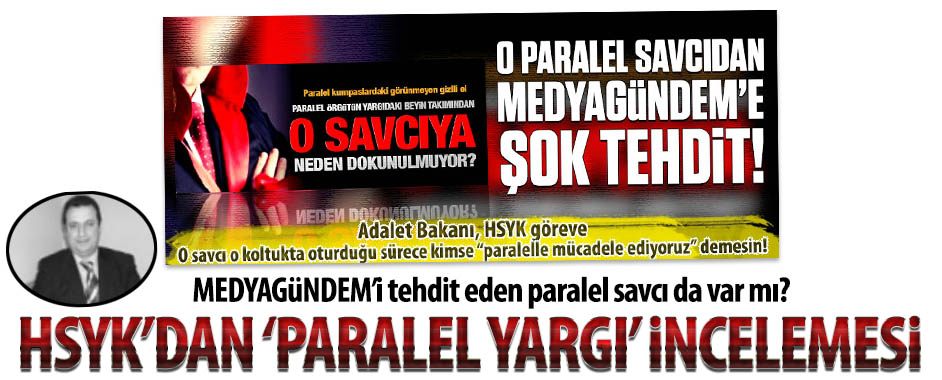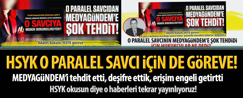 HSYK’nın başlattığı “paralel yargı” incelemesi gündeme bomba gibi düştü. HSYK’yı MEDYAGÜNDEM’i tehdit eden paralel savcı için de göreve çağırıyoruz. O savcı MEDYAGÜNDEM’i tehdit ettiğini deşifre etiğimiz haberlere de erişim engeli getirtti. MEDYAGÜNDEM HSYK bir kez daha görsün diye o haberleri aynen yayınlıyor. Yargıdaki paralel örgütün önemli isimlerinden biri olan …