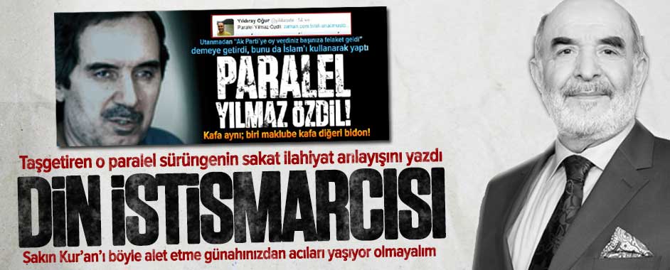 Star gazetesi yazarı Ahmet Taşgetiren bugün köşesinde Gülen örgütünün Yılmaz Özdil’i Zaman yazarı Ali Ünal’ın Kur’an ayetleriyle “Ak Parti’ye oy verdiniz başınıza felaketler geldi” diye yazmasının nasıl sakat bir anlayış olduğunu yazdı. Taşgetiren, “Nasıl bakmalı bu zihin yapısına, doğrusu şaşıp kalıyorum. Kur’an ayetini getir, kendi durduğun yere göre bir olaya giydir, …