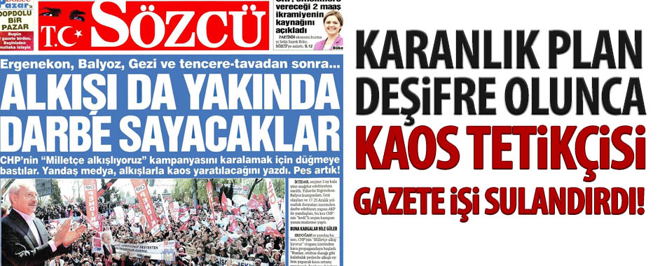 Karanlıktan beslenen kaos simsarlarının son sokakları karıştırıp, milleti birbirine düşürme planı deşifre olunca, kaos tetikçileri işi sulandırmaya başladılar. Kaos tetikçisi gazete Sözcü’nün bugünkü manşeti tam bir suçüstü halinin özetiydi. MEDYAGUNDEM.COM- CHP’nin “Milletçe alkışlıyoruz” kampanyasıyla eş zamanlı DHKP-C’nin de içinde yer aldığı bir kaos planıyla sokakları “alkış”la nasıl karıştırmak istedikleri deşifre …
