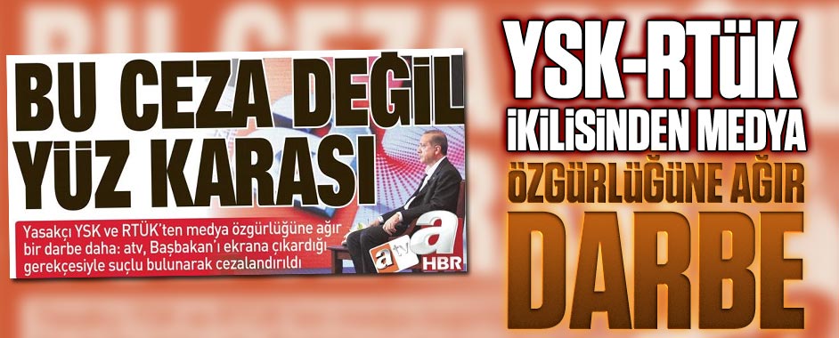 Başbakan’la program suç oldu: Yasakçı YSK-RTÜK ikilisinden medya özgürlüğüne ağır darbe. YSK, RTÜK’ün raporu doğrultusunda atv ve aHaber’e, Cumhurbaşkanı Erdoğan’ı, Köşk seçimleri öncesi ortak yayınına çıkardığı için ceza verdi. 30 Mart yerel seçimleri ve 10 Ağustos Cumhurbaşkanlığı seçimi döneminde verdiği skandal kararlarla medya özgürlüğüne ağır darbe vuran YSK-RTÜK ikilisi bir …
