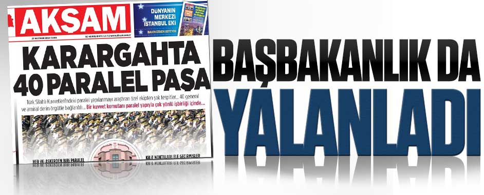Cumhurbaşkanlığı ve TSK’nın ardından Başbakanlık’tan da ‘TSK’daki paralel paşalar’ haberine tepki geldi. Akşam gazetesinin, “Karargahta 40 paralel paşa” başlıklı haberine, Cumhurbaşkanlığı Basın Merkezi ve TSK’nın ardından bir tepki de Başbakanlık’tan geldi. Açıklamada Başbakan’ın talimatıyla özel ekip kurularak TSK’daki paralel paşaların deşifre edildiği iddiası yalanlanarak aksine her türlü gizli yapılanma girişimleri karşısında …