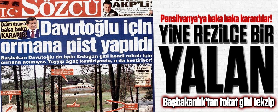 Başbakanlık, Başbakan Ahmet Davutoğlu’nun İstanbul’daki konutu için ormana pist yapıldığı yönündeki iddiaları yalanladı. Pensilvanya örgütüyle ilişkili Sözcü gazetesi, “Başbakan Ahmet Davutoğlu’nun kendisi için ağaç kestirip ormana pist yaptırdı” iddiasını manşetinden vermişti. Sözcü haberinde, Davutoğlu için Göktürk’te özel pist yapıldığı ve bunun için de ağaçların kesildiği iddia edilmişti. Çıkan haberle ilgili …