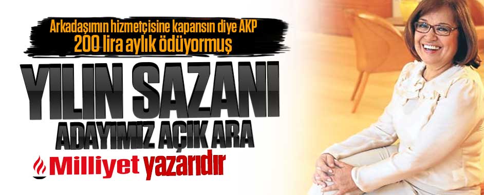 Milliyet gazetesi yazarlarından Meral Tamer, arkadaşının ofisinde çalışan hizmetli kadının para için kapandığını yazarak kendisini gülünç duruma düşürdü. Meral Tamer, bir arkadaşının Taksim’deki ofisinde yıllardır temizlik hizmetlerinde çalışan ve ‘aydınlık yüzlü’ olduğunu ifade ettiği genç kadının kapanmasını AK Parti’ye bağladı. Tamer’e göre genç kadın aylık 200 lira yüzünden kapandı; “AKP, …