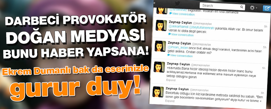 Bugün gazetesi ekonomi muhabiri Zeynep Ceylan, Twitter’dan sabah kız kardeşine saldırıldığını yazdı. Gezi Parkı’nda masum ağaç tepkisinin altından çıkan vandalizm, faşizm Doğan medyası tarafından görülmüyor. Doğan medyası bunu ikinci 28 Şubat darbesinin mimarı olarak gerçekleri gizliyor. Cemaatin sesi Zaman gazetesinin Doğan medyasıyla beraberliği “yeni derin ittifakın” içinde muhafazakar unsurun varlığını …