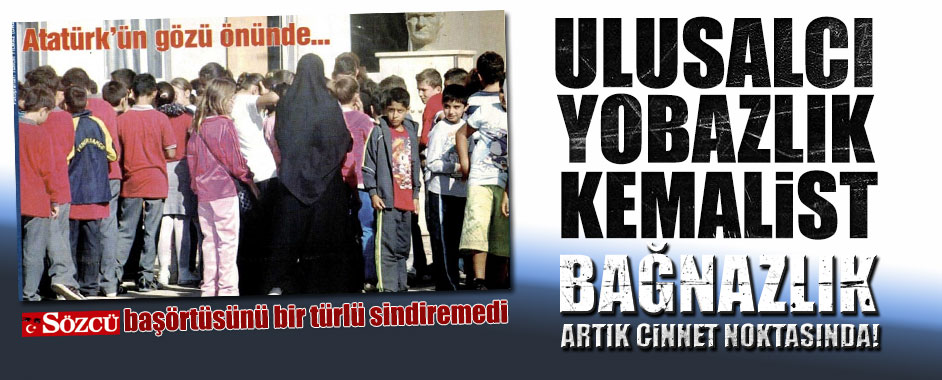 MEDYAGUNDEM.COM- Sözcü gazetesi “ulusalcı yobazlığın”, “kemalist bağnazlığın” hangi noktaya geldiğini gösteren bir manşet attı bugün. Artık kamuda başörtüsü yasağının olmamasını Sözcü kafasındaki “ulusalcı yobazlar” sindiremedi. Sözcü, okula örtüsü ile giden bir öğretmeni, çocukların İstiklal Marşı okuduğu tören sırasında fotoğrafladı. Başı kapalı bayan öğretmenle Atatürk büstünü aynı fotoğraf karesine oturtan Sözcü, …