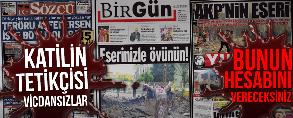 MEDYAGÜNDEM- Reyhanlı saldırısı gazetelerde de geniş yer bulurken Sözcü, Yurt ve Birgün gazetelerinin manşetleri “kan” kokuyordu. Vicdansız tetikçiler masum insanlarımızın eli kanlı bir zalim tarafından katledilmesinin faturasını Türkiye’ye çıkarıp, katili aklamanın telaşına düştüler… Sözcü, Yurt ve Birgün gazetelerinin manşetleri katilin medyadaki tetikçilerini de bir kez daha gözler önüne serdi. Sözcü gazetesi, …