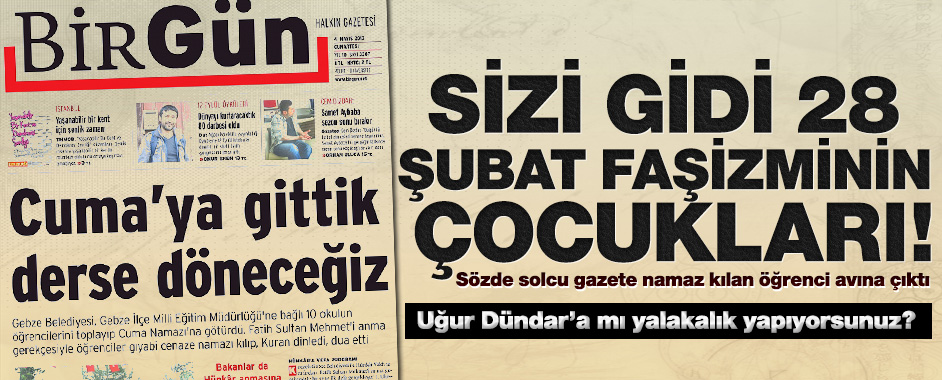 MEDYAGÜNDEM- Hep söylüyoruz, hep yazıyoruz, bunlara “solcu” denmez diye… Bunlar ne “özgürlükçü”, ne de demokrat… Bunlar bildiğiniz, o 28 Şubat’tan iyi tanıdığımız “faşist sistemin” çocukları… Uğur Dündarlardan, Emin Çölaşanlardan tanıdık tavır bugün Birgün isimli sözde solcu gazetenin manşetindeydi. “Cuma’ya gittik derse döneceğiz” manşet haberiyle, Gebze’de Fatih Sultan Mehmet’i anma etkinliklerinde …