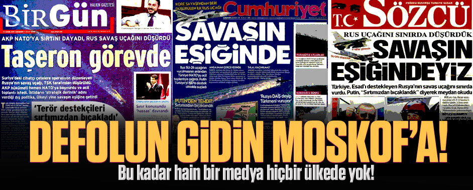 Rusya’nın savaş uçağının düşürülmesinde dünya basını bile Türkiye’yi haklı bulurken, Türk medyasından Cumhuriyet, Sözcü, Birgün gibi gazeteler Rusya tarafını tutan manşetlere imza attılar. Unutmayalım bu üç gazete aynı zamanda Fetocu terör örgütünün de kullanışlı tetikçileri… Gazeteler, sanki Rus uçağı Türk sınırını ihlal etmemiş gibi, Türk jetleri Rus uçağına defalarca uyarı …