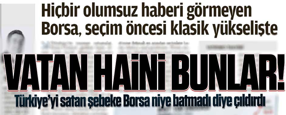 MEDYAGUNDEM.COM- Gülen örgütünün “vatan haini” bir ihanet şebekesi olduğuna dair size çarpıcı bir kanıt daha… Bugün Zaman gazetesinin borsa sayfasında atılan şu başlığa bakın: “Hiçbir olumsuz haberi görmeyen Borsa, seçim öncesi klasik yükselişte.” Hainliği görüyor musunuz? Adamlar soysuzluğu ve ihaneti başlığa taşımışlar, “nasıl olur da Borsa batmaz” demeye getiriyorlar. “Türkiye …
