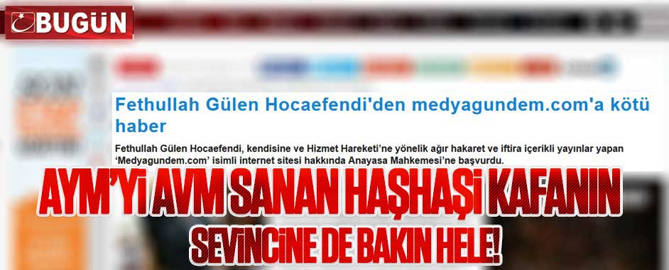 MEDYAGUNDEM.COM- Paralel elebaşı Fetullah Gülen MEDYAGÜNDEM’i susturmak için bu kez de Anayasa Mahkemesi’ne başvurunca haberi paralel medyada büyük sevinç yarattı! Paralel Bugün gazetesinin internet sitesi MEDYAGÜNDEM’e olan nefretinden sevincini manşete şu başlıkla çekerek gösterdi: Tabii AYM’yi “AVM” gibi algılayan haşhaşi kafası “MEDYAGÜNDEM’e kötü haber” diye de manşet atar. Maklube yemekten, …