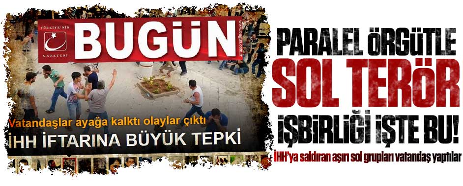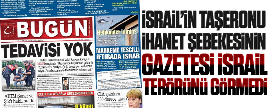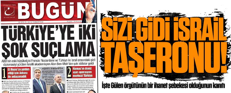 MEDYAGUNDEM.COM- Gülen örgütünün ABD Neoconları ve siyonist İsrail’in işbirlikçisi olduğunun çarpıcı bir kanıtı daha ortaya çıktı. Gülen örgütünün finansörü Akın İpek’in sahibi olduğu BUGÜN gazetesinin bugünkü sürmanşeti, Gülen örgütünün Türkiye’ye ihanet eden, Türkiye düşmanı, İsrail işbirlikçisi bir şebeke olduğunun örneğini orta yere serdi. “Türkiye’ye iki şok suçlama” manşetiyle çıkan BUGÜN …