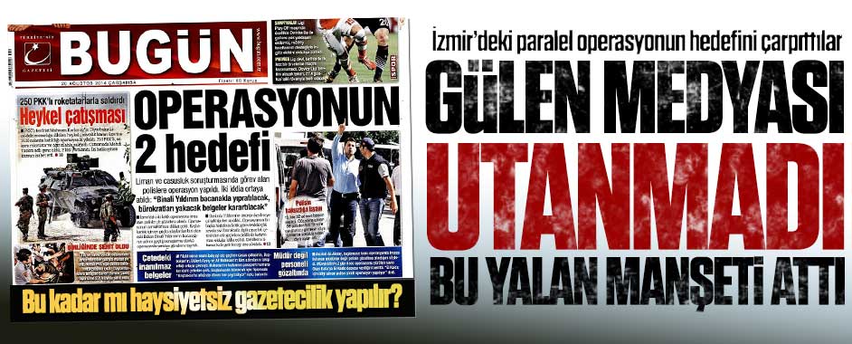 MEDYAGUNDEM.COM- Gülen örgütünün tetikçisi gazetelerden BUGÜN, Gülen örgütünün yalanı bir “karakter” haline getirdiğinin kanıtı oldu. Bugün gazetesi bugün resmen yalan bir manşetle çıktı. İzmir’de yapılan paralel polislere yönelik operasyonu Bugün gazetesi, “İzmir’de yürütülen askeri casusluk ve liman yolsuzluğu soruşturmalarında görev alan polislere operasyon düzenlendi.” diye gösterdi. Öyle bir yalan hikaye yazan …