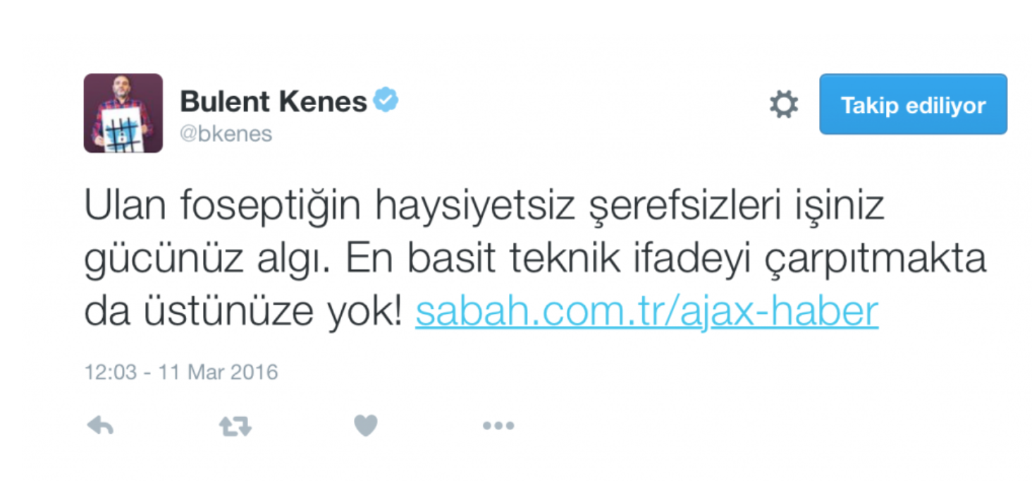 Fetullahçı terör örgütünün en müptezel küfürbaz tetikçilerinden biri olan Bülent Keneş, her fırsatta Twitter’dan küfür ve hakaret saçıyor. Cumhurbaşkanı Erdoğan başta olmak üzere devlet büyüklerine hakareti bir alışkanlık haline getiren Keneş, efsunlanmış bir kör gözlülükle FETÖ’yü savunuyor. Bugün pek çok gazetenin manşetinde yer alan FETÖ’nün gazeteci Haydar Meriç cinayeti haberi …