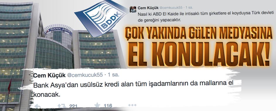 Gülen örgütünün bankası Bank Asya’ya TMSF tarafından el konulmasının ardından Yeni Şafak yazarı Cem Küçük Twitter’da bombaladı… “Nasıl ki ABD El Kaide ile intisaklı tüm şirketlere el koyduysa Türk devleti de gereğini yapacaktır.” diyen Küçük, yakında Gülen örgütün medyasına da el konulacağını yazdı. İşte tivitleri: * Çok yakında paralel yapının …