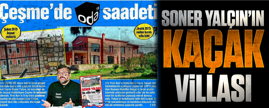 Gazeteci Soner Yalçın, Çeşme’de tarım arazisi üzerine lüks villa yaptırdı. Mühürlenen kaçak villa hakkında yıkım kararı çıktı. Hakkında yasal işlem başlatılan Soner Yalçın, yargı önüne çıkacak. Sözcü Gazetesi yazarı, odatv. com’un sahibi Soner Yalçın’ın Türkiye’nin en gözde tatil beldelerinden biri olan Çeşme’de tarım arazisine lüks kaçak bir villa yaptırdığı ortaya …