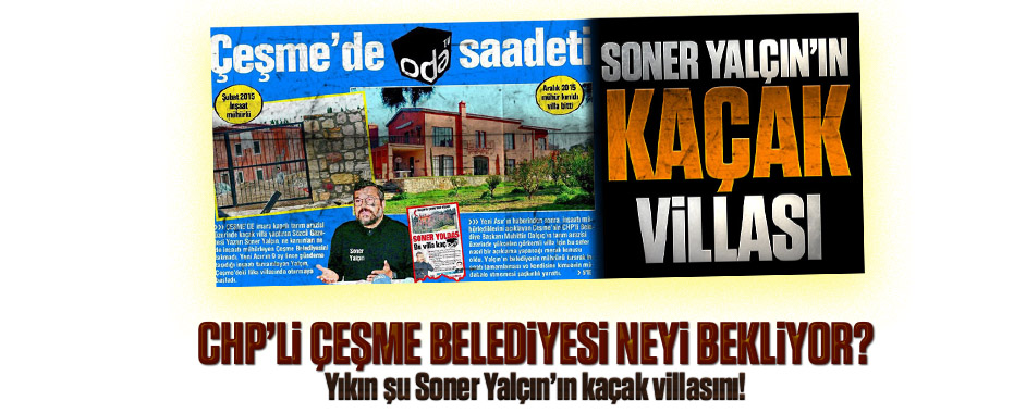 Yeni Asır gazetesi Sözcü yazarı Soner Yalçın’ın Çeşme’deki kaçak villasının peşini bırakmıyor. Bugün de Yeni Asır yazarı Zafer Şahin CHP’li Çeşme Belediyesi’ne “Yıkım için neyi bekliyorsunuz?” diye sordu. İşte yazısı: Bu sorunun yanıtı çok önemli… CHP eğer gerçekten sosyal demokrat bir partiyse Sözcü yazarı Soner Yalçın’ın Çeşme’de imara kapalı tarım arazisi …