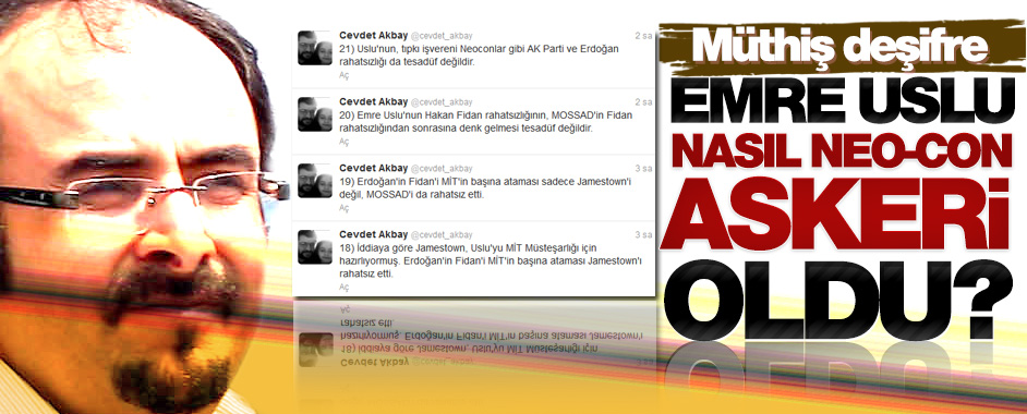 MEDYAGUNDEM.COM- Taraf yazarı Emre Uslu’nun nasıl bir Neo-con ve MOSSAD destekli Jamestown Vakfı beslemesi olduğunu sık sık yazılarında ve sosyal medyada gözler önüne seren Fayetteville State Üniversitesi öğretim üyelerinden Doç. Dr. Cevdet Akbay, Twitter’da Uslu hakkında çarpıcı bir deşifre daha yaptı. “E.Uslu’yu ‘her dediği çıkan adam’ olarak pazarlayanlar, onu MİT’in …