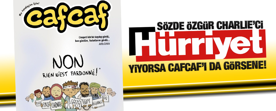 Mizah dergisi Cafcaf, Charlie Hebdo’nun son saygısız tutumuna özel bir kapak hazırlayarak ile cevap verdi. Özellikle sözde özgür ve objektif olduğunu iddia eden Charlie’ci Hürriyet gazetesinin Cafcaf’ı yok saymasına dikkat çekiyoruz. Küstahlığı huy edinen Avrupa kültürünün kendisini özgür ve sorgulanamaz bir konuma yerleştirme çabalarına tüm dünyada tepkiler sürerken anlamlı bir …