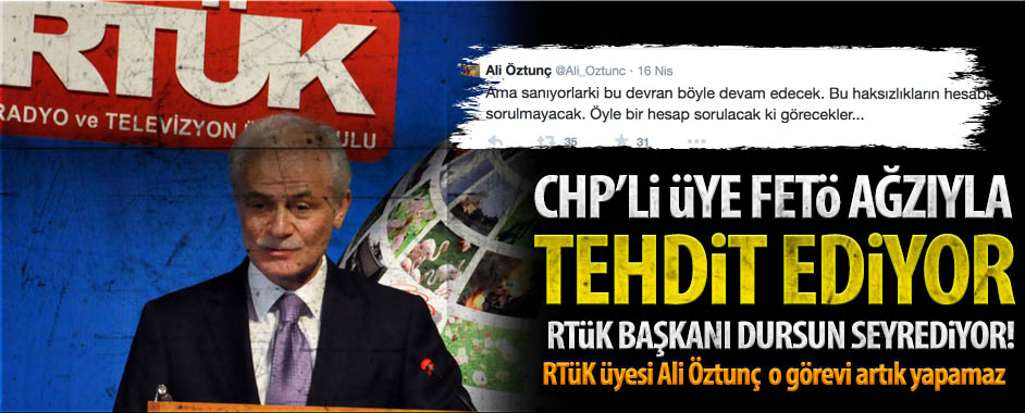 RTÜK’te bir skandal daha… RTÜK Başkanı Davut Dursun seyirci! Kurumun CHP’li üyesi Ali Öztunç skandal tweetleriyle “ihsas-ı rey” yaptı! MEDYAGUNDEM.COM- Paralel suç örgütünün kontrolünde olduğu iddialarıyla sık sık gündeme gelen RTÜK’ten bir skandal daha…RTÜK’ün CHP’li üyesi Ali Öztunç, Twitter’da yaptığı yorumlarla resmen “ihsas-ı rey”de bulundu. Yani hukuki ve etik olarak yasak …