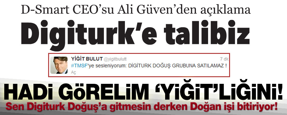 MEDYAGÜNDEM- Gezi Parkı provokasyonunun en hararetli günlerinde Yiğit Bulut, Twitter üzerinden bir çağrı yaparak, “TMSF’ye sesleniyorum, Digiturk Doğuş grubuna satılamaz” demişti. Şimdi aynı tavrı Aydn Doğan’a da göstermesi bekleniyor. Çünkü TMSF’nin kontrolüne geçen dijital yayın platformu Digiturk’e en büyük rakibi Aydın Doğan’ın D-Smart’ı talip oldu. Hürriyet gazetesinden duyurulan haberde D-Smart …