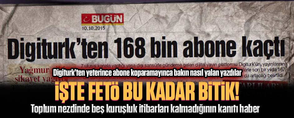 FETÖ’ye yakınlığı ile bilinen 7 TV kanalının Digiturk’ten çıkarılmasının yankıları sürüyor. Doğan ve FETÖ medyasının başlattığı kara propaganda sonuç vermedi. Bugün Gazetesi’nin “168 bin kişi aboneliğini iptal ettirdi” haberi yalan çıktı. Digiturk’ten alınan bilgilere göre, FETÖ’ye yakın TV kanallarının Digiturk’ten atıldıktan sonra 2400 kişi Digitürk aboneliğini iptal ettirdi. Gülen örgütüne …