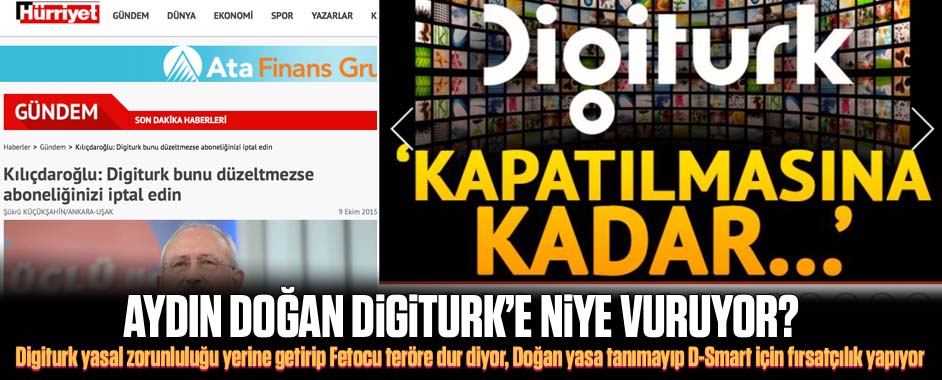 Digiturk Fetocu terör örgütü kanallarını yasal bir zorunluluk gereği yayın listesinden çıkardı. FETÖ CHP ile işbirliği halinde Digiturk’e karşı terörist kampanya başlattı. Hürriyet de FETÖ tarafından tehdit edilince Aydın Doğan da terörist kampanyaya katıldı. MEDYAGUNDEM.COM- Digiturk, yasal zorunluluktan dolayı Kanaltürk, Samanyolu TV, Mehtap TV, S Haber, Bugün TV, Yumurcak TV …
