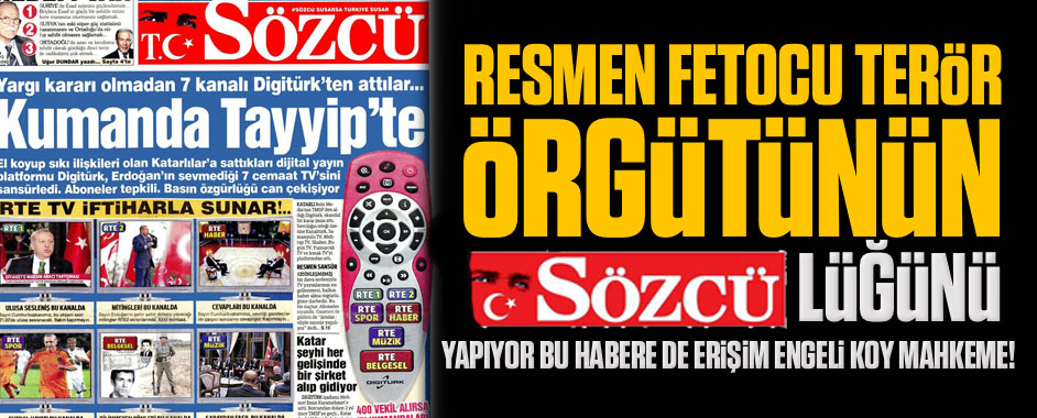 Türkiye devleti dört bir koldan Fetullahçı Terör Örgütü ile mücadele ederken, FETÖ tarafından finanse edilen Sözcü Gazetesi, kirli örgütün sözcülüğünü üstleniyor. Yazarları ile birlikte Fetullahçı Terör Örgütü’ne destek veren Sözcü, bugün de Digitürk’ten atılan Gülen medyasına destek verdi. Sözcü Gazetesi 251 yıl hapis cezası ile yargılanan Fetullah Gülen ve örgütünü …