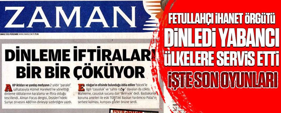 Fetullahçı terör örgütü devleti dinledi sonra da yabancı ülkelere servis etti. Hem terör örgütü hem de ihanet suç şebekesi… Fetullahçılar her zamanki taktikle suçlarını örtmek için yeni bir algı operasyonuna başladılar. Zaman gazetesi manşetten verdiği “dinleme iftiraları bir bir çöküyor” başlıklı haberde yalanlamak istediği skandalı farkında olmadan doğruladı. Alman Focus …