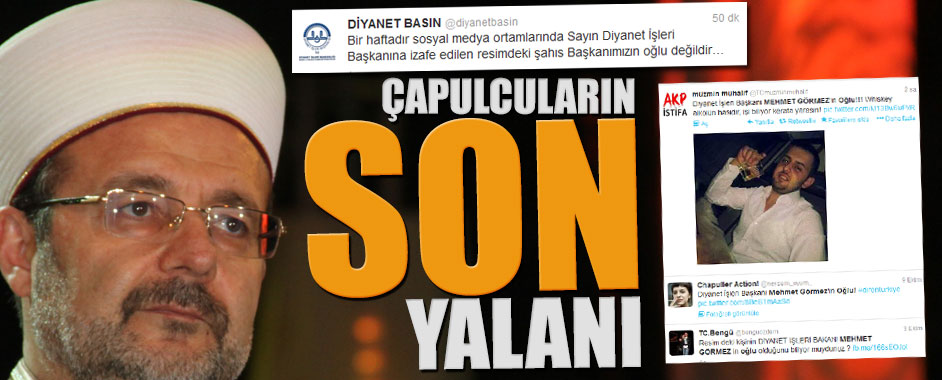 MEDYAGUNDEM.COM- Son bir haftadır sosyal medya ortamlarında Diyanet İşleri Başkanı Prof. Dr. Mehmet Görmez’le ilgili yürütülen bir kampanya hakkında Diyanet İşleri Başkanlığı resmi twitter hesabından şu açıklamayı yaptı: DİYANET BASIN @diyanetbasin 18 dk Bir haftadır sosyal medya ortamlarında Sayın Diyanet İşleri Başkanına izafe edilen resimdeki şahıs Başkanımızın oğlu değildir… DİYANET BASIN @diyanetbasin 18 dk …