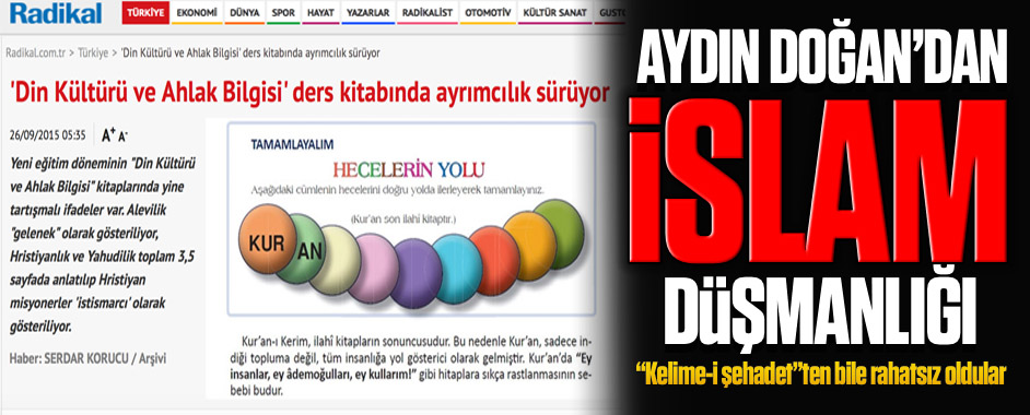 Doğan medyası yine bir skandala imza attı. 2015-16 Milli Eğitim müfredatını eleştiren Radikal.com.tr, islamın en temel ilkelerinden olan “kelime-i tevhit” ve “kelime-i şehadet”in kitapta yer almasından rahatsız oldu. Radikal, Kuran-ı Kerim’in son kitap olarak anlatılmasını da “ayrımcılık” olduğunu belirterek eleştirdi. Doğan medyasının bu skandal haberi sosyal medyada tartışma konusu oldu. …