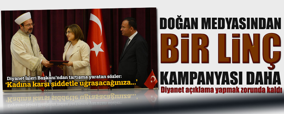 MEDYAGUNDEM.COM- Diyanet İşleri Başkanı Mehmet Görmez’in, Birleşmiş Milletler (BM) projesi olan ve kadına karşı din adamlarının eğitilmesini öngören projenin protokol imza töreninde gündeminde yaptığı konuşma Doğan medyası tarafından provokasyon malzemesi yapıldı. “Ailenin Korunması ve Kadına Yönelik Şiddetin Önlenmesinde Din Görevlilerinin Katkısının Sağlanması” konulu işbirliğinin imza protokolü töreninde konuşan Diyanet İşleri …