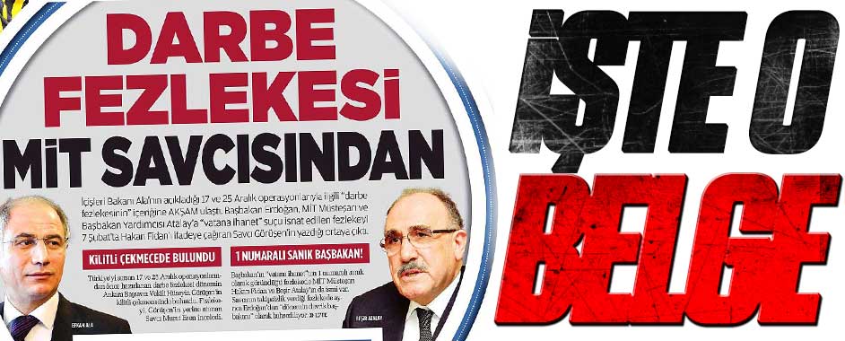 Başbakan ve İçişleri Bakanı’nın bahsettiği “darbe fezlekesinin” altından MİT Müsteşarı’nı ifadeye çağıran Savcı Görüşen çıktı. Erdoğan, Fidan ve Atalay hakkında ‘vatana ihanet’ suçu isnat edilen fezlekeyi yeni Savcı Esen buldu. Başbakan Recep Tayyip Erdoğan ve İçişleri Bakan Efkan Ala’nın bahsettiği “Darbenin fezlekesi bile hazır. Belgelerde Erdoğan’dan dönemin başbakanı diye bahsediliyor” …