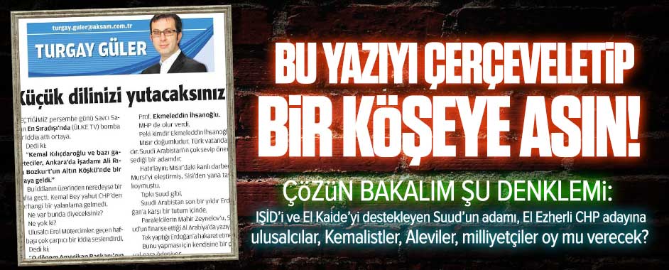 MEDYAGUNDEM.COM- Öyle bir denklem ki; imam Hatip mezunu bir cumhurbaşkanına tahammül edemeyen CHP, akademik hayatına El Ezher Üniversitesi’nde başlayan İhsanoğlu’nu aday yaptı. Bu şu demek; şimdi ulusalcılar, Kemalistler, Aleviler, milliyetçiler bu adama oy verecek. Bir de denkleme Suudi Arabistan’ı ekleyin. Suud’un IŞİD ve El Kaide’ye verdiği desteği de bu denklemin …