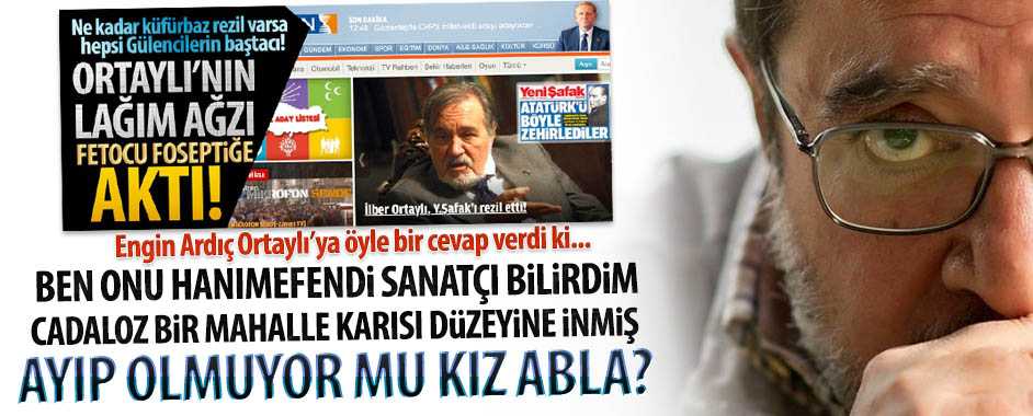Sabah gazetesi yazarı Engin Ardıç, kendisine hakaret eden Prof. Dr. İlber Ortaylı’ya öyle bir yanıt verdi ki… İşte cevabı: MAHALLE KARISI DÜZEYİNE DÜŞMÜŞSÜN KIZ ABLA! İlber Ortaylı, sağolsun, bana cevap vermiş. Hakkımda söyledikleri aynen şöyle: “Bir tane herif var, eski solcu, alkolik, geri zekâlı… O da konuşuyor… Git başka tarih kitabı …