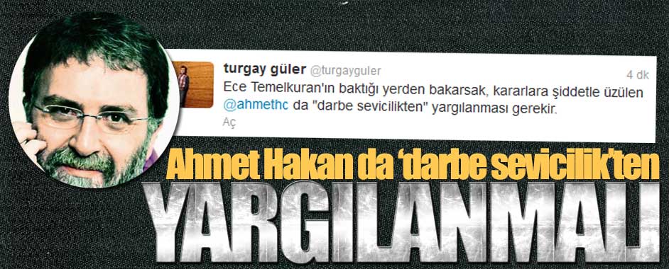 MEDYAGUNDEM.COM- Ergenekon davasından çıkan kararlar için Ece Temelkuran’ın “Bu kararlara sevinenlere birgün aynı adalet uygulanır” sözleri ve sözde solcu yazarın “darbe” tehdidi tartışılıyor. Gazeteci Turgay Güler, Twitter’da Temelkuran’ın sözünü eleştirdikten sonra Hürriyet yazarı Ahmet Hakan için de “Kararlara şiddetle üzülen Ahmet Hakan’ın da ‘darbe sevicilikten’ yargılanması gerekir.” dedi. Güler’in Ahmet …