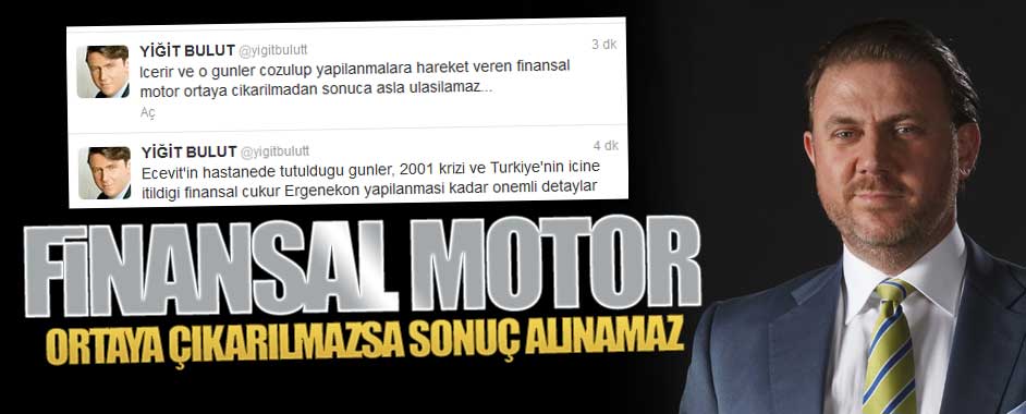 MEDYAGUNDEM.COM- Başbakan Erdoğan’ın başdanışmanı Yiğit Bulut, Twitter’da Ergenekon davasına ilişkin önemli açıklamalar yaptı. Şamil Tayyar’ın Mehmet Haberal’in ani tahliyesi ile ilgili “Gizli tanık değilse başka birşey var” açıklamasına atıfta bulunan Bulut, “Ecevit’in hastanede tutulduğu günler, 2001 krizi ve Türkiye’nin içine itildiği finansal çukur Ergenekon yapılanması kadar önemli detaylar içerir ve …