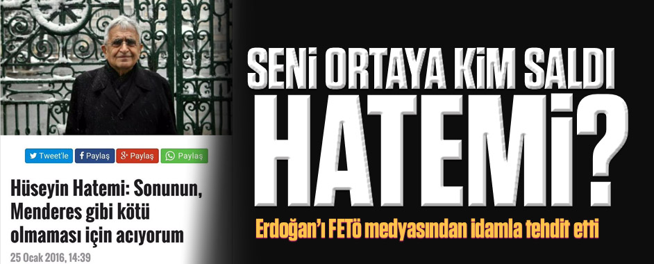 Profesör Dr. Hüseyin Hatemi cemaatin dergisine verdiği röportajda ölümle tehdit edildiğini söylerken Cumhurbaşkanı Erdoğan’ı ‘Menderes’ örneğiyle tehdit etti. Paralel medyanın yayın organı Aksiyon dergisine konuşan Prof. Dr. Hüseyin Hatemi, Cumhurbaşkanı Erdoğan’ı tehdit etti. Hatemi, “Erdoğan’ın sonunun, Menderes gibi kötü olmaması için acıyorum” ifadelerini kullandı. 24 TV’de yayınlanan Günün Manşeti programında …
