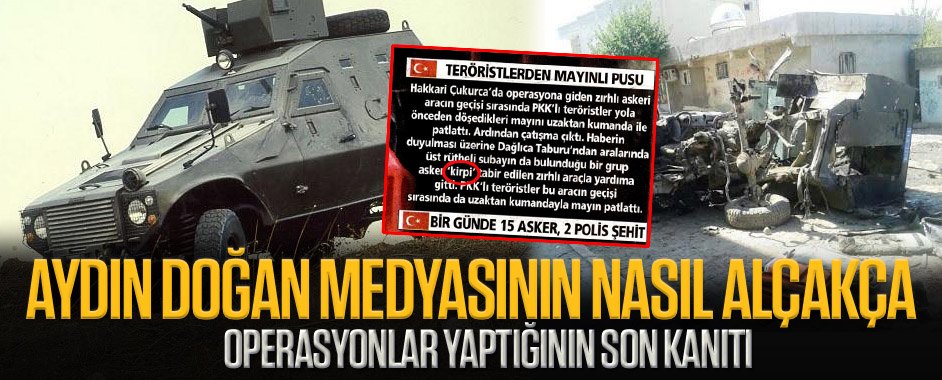 Aydın Doğan medyasının nasıl alçakça operasyonlar yaptığının bir kanıtı daha… MEDYAGUNDEM.COM- Aydın Doğan, öylesine alçakça bir savaş yürütüyor ki Türkiye’ye karşı… Yaptığı her iş bir sinsi ve adi operasyonu amaçlıyor. İşte size bir örnek daha… Dün Posta gazetesinin manşeti… Dağlıca’daki şehitlerimiz için “Türkiye ağlıyor” başlığını attılar. Haberin spotunda da şöyle bir …