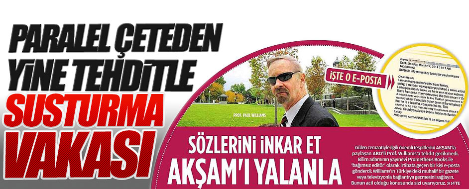 AKŞAM’ın FBI’in eski danışmanlarından Prof. Williams’la yaptığı Gülen röportajı, paralel yapıyı harekete geçirdi. Profesörün yayınevine yazı gönderen “Türk editör” tehdit etti. Eski FBI danışmanlarından, radikal İslam ve terör uzmanı Prof. Paul L. Williams’ın Fethullah Gülen’le ilgili araştırmalarının yer aldığı haberin ardından paralel yapı elemanlarının ünlü akademisyenin kitaplarını basan yayınevine bir …