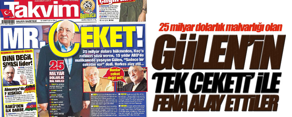 Fethullah Gülen cemaatine ait bir gazeteye konuştu. Günlerdir reklamları yapılan röportajda hoca dişe dokunur bir söz etmedi. Akıllarda ise 25 milyar dolarlık yapının başındaki Gülen’in tek bir ceket sahibi olduğu kaldı Paralel devlet, casusluk, dinlemeler, tapeler, seçim telaşı derken gündeme Fethullah Gülen’in röportajı oturdu. Süreç boyunca suskun olduğunu iddia eden …