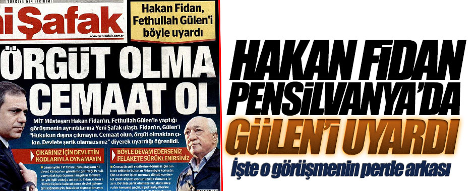 MİT Müsteşarı Hakan Fidan’ın, Fethullah Gülen’le yaptığı görüşmenin ayrıntılarına Yeni Şafak ulaştı. Fidan’ın, Gülen’i ‘Hukukun dışına çıkmayın. Cemaat olun, örgüt olmaktan çıkın. Devlete şerik olamazsınız’ diyerek uyardığı öğrenildi. Gülen Medya Grubu televizyonlarından Samanyolu TV’nin Yayın Grubu Başkanı Hidayet Karaca’nın geçtiğimiz günlerde gündeme getirdiği ‘Pensilvanya görüşmesi’nin ayrıntılarına Yeni Şafak ulaştı. Karaca’nın …