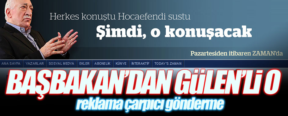Başbakan Erdoğan Manisa’daki mitingte Zaman gazetesinin ‘Herkes konuştu, şimdi o konuşacak’ reklamına cevap verdi. Pazartesi günü Zaman Gazetesi’nde yayınlanacak olan Fethullah Gülen röportajının çeşitli medya kuruluşlarında yayınlanan reklamında yer alan ‘Herkes konuştu, şimdi o konuşacak’ sözlerine Başbakan Erdoğan Manisa’daki mitingde cevap verdi. İşte Erdoğan’ın o sözleri: Pensilvanya’da inzivaya çekilmiş. İnzivaya …
