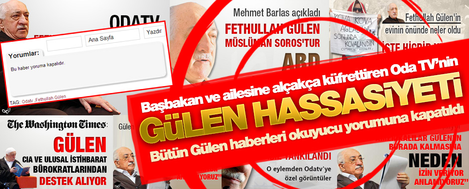 MEDYAGUNDEM.COM- Soner Yalçın’ın sahibi olduğu Oda TV, hükümete ve özellikle de Başbakan Erdoğan’a karşı her türlü “psikolojik operasyon” usulleri ile saldırıp, haberlerin altındaki yorumlarla küfür ettiririrken, mesele fethullah Gülen olduğunda son derece farklı bir “hassasiyet” gösterdiği ortaya çıktı. Oda TV’de Fethullah Gülen’le ilgili haberlere okuyucu yorumlarına kapatılıyor. Başbakan Erdoğan ve …